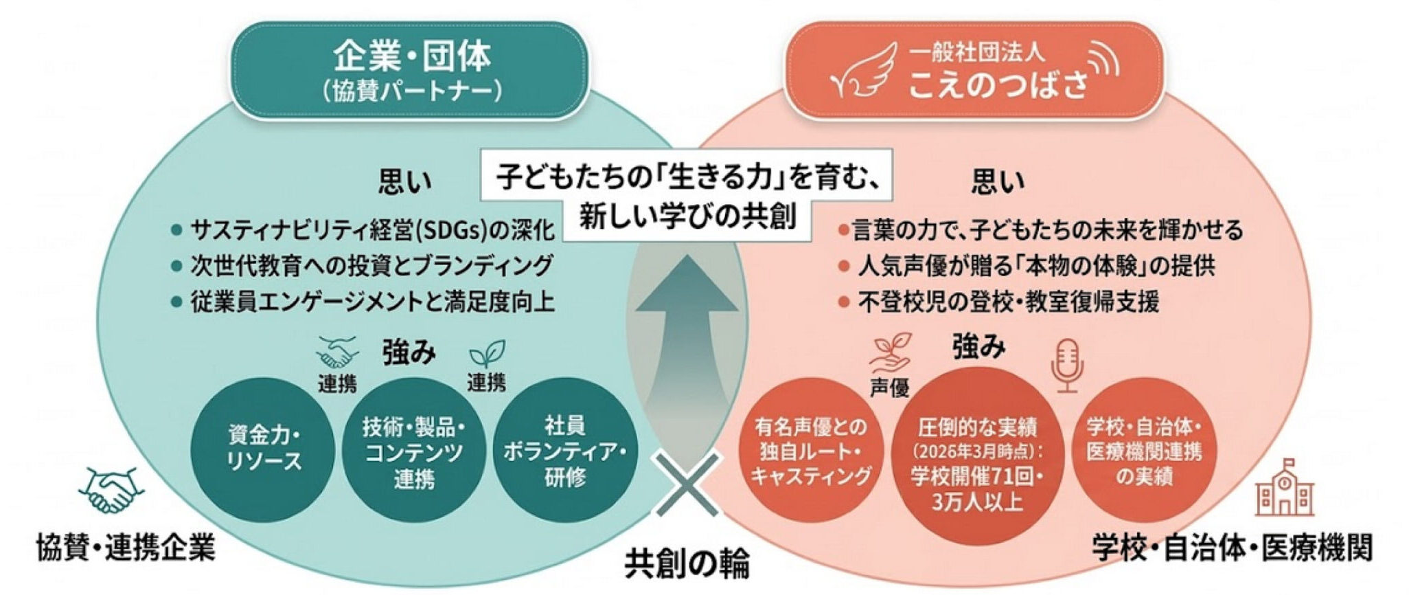 「○○社×こえのつばさ」の冠イベント設計、地域・学校・病院と連携した長期支援プロジェクトなど、企業のサステナビリティ戦略に組み込める活動を共同設計します。単発ではなく継続的な取り組みとして構築可能。