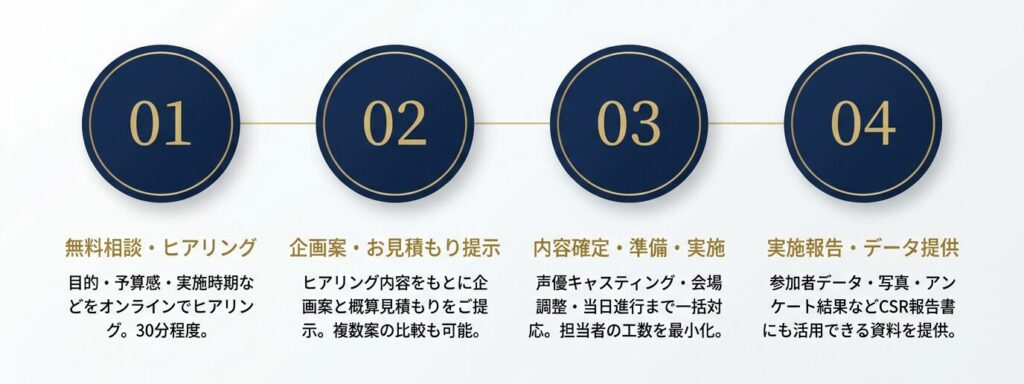 企画立案・声優調整・当日進行・実施報告まで一括対応。担当者の工数を最小化します。「何を頼めばいいかわからない」という段階からでもお気軽にご相談ください。