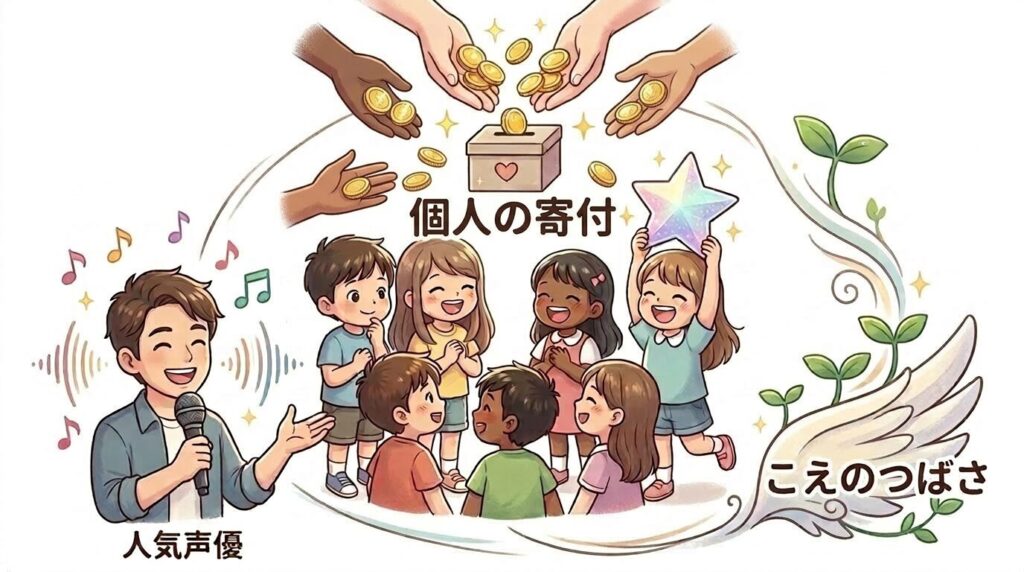 こえのつばさは声優の皆さまと一緒に活動してします。子どもたちの明るい未来づくりにご支援をお願いいたします。